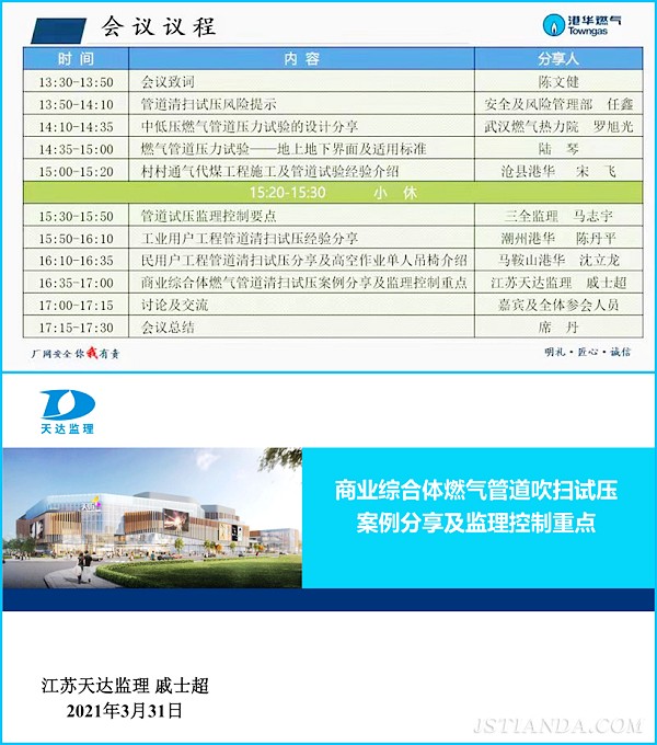 天達監理公司各港華監理部均在所在的港華合資公司會議室集中觀看了本次視頻會議。會上,蘇州分公司戚士超副經理代表天達監理公司作了題為《商業綜合體燃氣管道吹掃試壓及監理控制重點》的案例分享,介紹了我公司港華監理部在大型商業綜合體吹掃試壓中的經驗做法、控制重點,得到了集團領導和與會單位的一致認同,也借此機會展示了天達監理專業化的服務水平,樹立了公司在港華集團中的品牌形象。