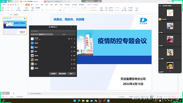 當前,蘇州及周邊城市疫情處于高位流行,防控形勢異常嚴峻。4月16日下午,天達監理蘇州分公司緊急召開疫情防控工作專題會議。本次會議以視頻會議形式召開,各職能部門、各監理部負責人參加了會議。