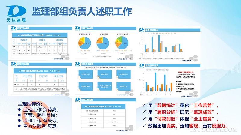 述職會上,各監(jiān)理部組負責人立足崗位職責,從“德、能、勤、績、廉”五個方面匯報了履職期間的思想動態(tài)、領(lǐng)導(dǎo)能力、工作作風(fēng)、工作成績和廉潔自律方面的情況。在蘇南分公司積極部署下,今年的述職會議超過80%監(jiān)理部組負責人以PPT形式進行了匯報,更有超過半數(shù)的述職匯報中引用了大量的數(shù)據(jù)、圖表、案例,詳細地做了全面客觀分析總結(jié)。用“數(shù)據(jù)統(tǒng)計”量化了“工作苦勞”,用“履職分析”展示了“監(jiān)理成效”,用“付款時效”體現(xiàn)了“業(yè)主滿意”,讓更真實、更客觀、更有說服力的數(shù)據(jù)替代了以往存在的主觀性評述。并且,各監(jiān)理部組在匯報中還詳細闡述了2022年工作中的特色亮點,總結(jié)了成績經(jīng)驗,反思了存在的問題,提出了加強和改進工作的思路措施及謀劃了明年工作的具體方向。
