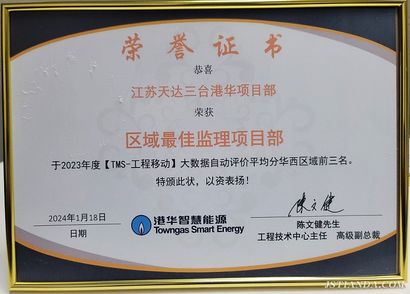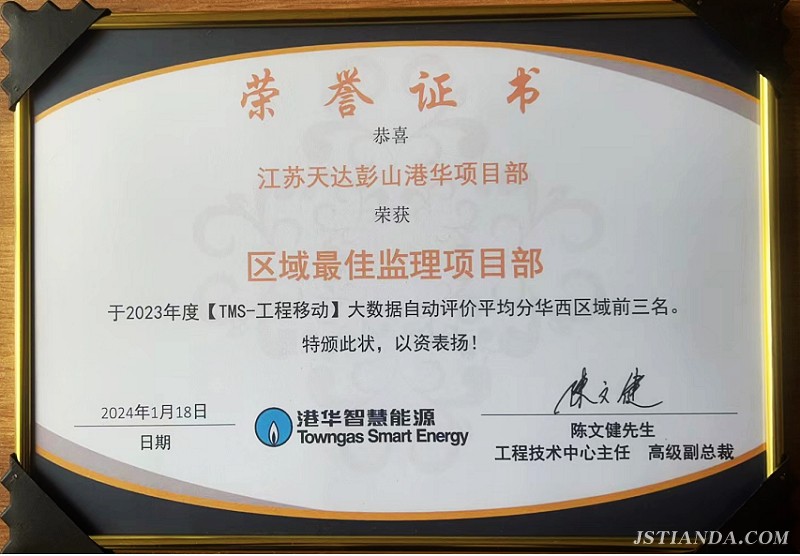 江蘇天達彭山港華監理部、江蘇天達三臺港華監理部于2023年度【TMS-工程移動】大數據自動評價平均分排名港華智慧能源華西區域前三名,同時榮獲區域****監理項目部。