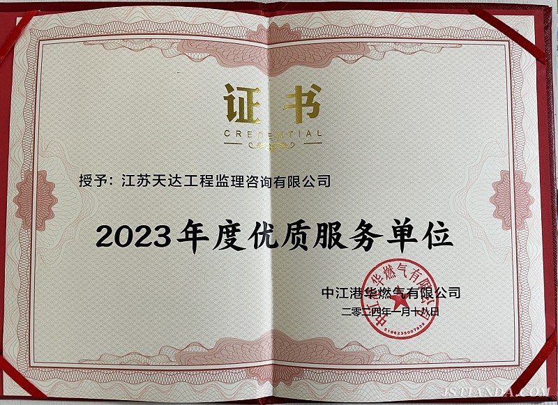 江蘇天達中江監理部榮獲“2023年度優質服務單位稱號”。