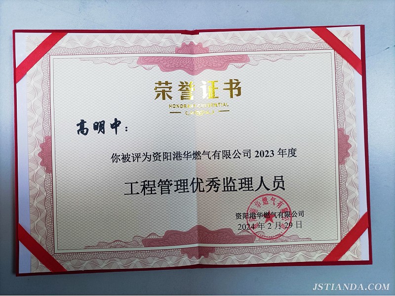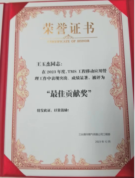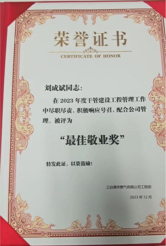 三臺港華監理人王玉杰在2023年度TMS工程移動應用管理工作中表現突出,成績顯著,被評為“****貢獻獎”,監理人劉成斌在2023年度干管建設工程管理工作中盡職盡責,積極響應號召,配合公司管理,被評為“****敬業獎”,資陽港華監理人高明中被評為“工程管理優秀監理人員”。