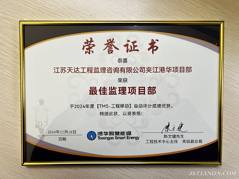 近日,天達監理彭山港華項目部和夾江港華項目部榮獲了由港華集團頒發的“監理項目部”稱號。該獎項為港華集團采用【TMS-工程移動】2024年度自動評分所獲。